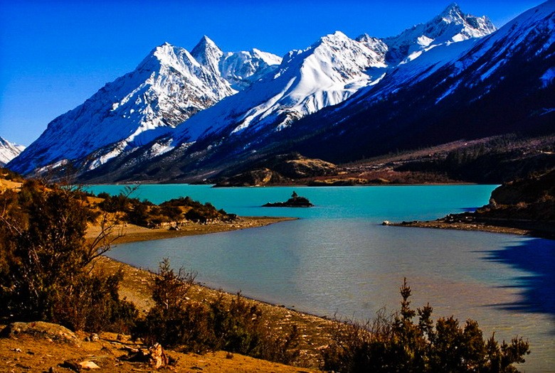 从八宿出发前行90km就来到神往以久的然乌湖畔。然乌湖是著名的高原冰川湖,面积22平方公里,海拔3850米。湖畔是茂密的原始森林,碧蓝的湖水,森林倒映,清澈见底,湖面的水鸟成群,一派仙境景色。来到这里会让人躁动的心沉静下来,湖水如一面镜子般平静无澜,映衬着湖边晶莹的冰川、皑皑的雪山,如一个待嫁的娇娘,动人心魄。被雪山和森林环抱的美丽小镇波密县城扎木镇,海拔1100米,空气清新,十分迷人,被称作“西藏的小瑞士”。由于这里是东喜马拉雅山山脉所在,所以抬头眺望,四周皆是白雪皑皑的雪峰。