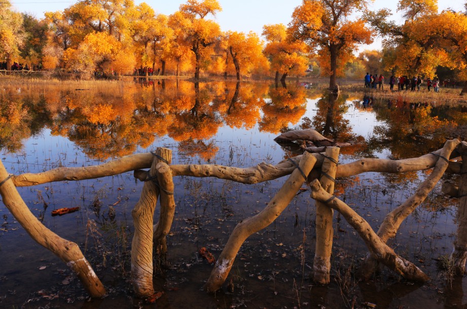 当你徒步走进林子里,就能嗅到胡杨树沁人心脾的幽幽清香,夕阳挥洒着一抹抹光,树叶黄的发亮,亮的照人,一片片、一簇簇调皮地眨着眼。有的树干笔直直入云霄,大有“欲与天公试比高”之势,有的则盘虬卧龙,似有亲吻大地之心。用“神奇”形容胡杨树一点也不过分,胡杨的叶子在一天不同的时间你会看到不同的颜色,在不同的角度看到的叶子颜色也有所不同。晨曦在人们的脸上驻足,在池中留影,似与胡杨争宠,又似与胡杨嬉戏,人们的脸上写满了惊讶与欢喜,写满了不枉此行。额济纳的胡杨静立在这片浩瀚的土地上,“三百年不死,死了三百年不倒,倒了三百年不朽。