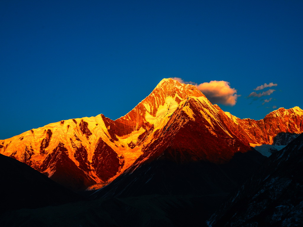 今天的行程颇为轻松,如果昨天傍晚在子梅垭口未能看到主峰,队员可以选择两种方案来弥补遗憾:1、在子梅村联络当地面包车再上垭口拍摄贡嘎日出(费用400~500元/辆往返,自理)。2、当然,也可以从子梅村徒步到贡嘎寺休整之后,继续徒步到贡嘎山背后的冰川观景台,在这里有独立无二的角度,可以看到非常壮观的贡嘎主峰和Y字型的贡巴冰川,这是我们推荐的方案,因为我们徒步所在的位置位于贡嘎主峰西面,傍晚的光线会更完美!晚上返回贡嘎寺住宿。贡嘎寺是藏传佛教噶玛噶举派(白教)的三大圣地之一,是藏密五大金刚之一胜乐金刚的道场。它不仅是一个著名的宗教胜地,也是贡嘎主峰的最佳拍摄地点之一。