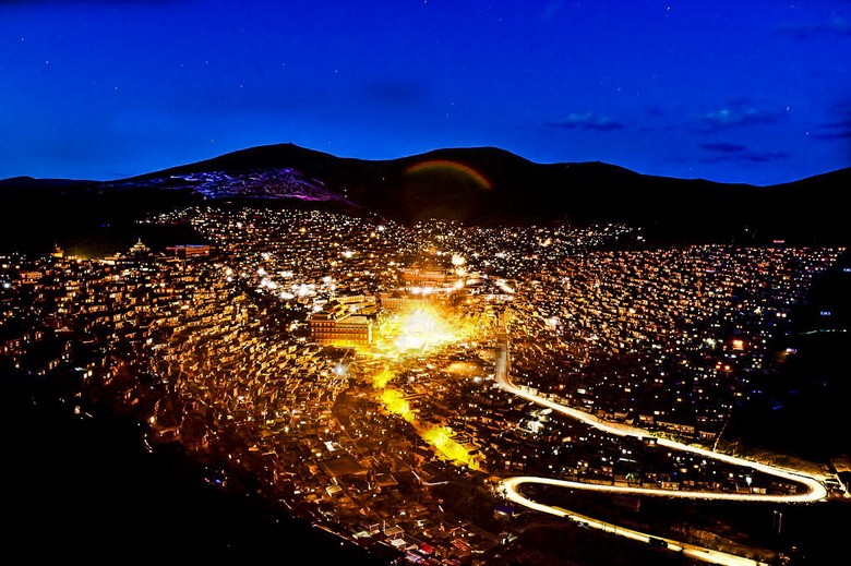 五明佛学院 距色达县城20余公里有一条山沟叫喇荣沟,顺沟上行数里,蔚蓝苍穹之下,银岭碧草之间,数千间赫红色的木屋,如众星拱月般簇拥着几座金碧辉煌的大殿--它就是藏于深山中的喇荣寺五明佛学院,也称色达佛学院。色达佛学院是世界上最大的藏传佛学院。常住的喇嘛有两万多人。每遇有佛事活动人数还会增加,最多时可达四万多人。这里的僧舍很壮观,如果你是初次到色达,其庞大的阵势往往会让你目瞪口呆。连绵数公里的山谷布满了密密麻麻的小木棚屋,成千上万喇嘛和尼姑的宿舍,谷底和山梁上分布着几座寺庙和佛堂,建筑规模虽都不很大,但装饰考究而辉煌;身披桨红色僧袍的喇嘛和尼姑来来往往,空气中充满生机和祥和气氛。在佛学院最高的山峰上,有一个金碧辉煌的建筑,叫做“坛城”(音译)。它的上半部分是转经的地方,据说如果你有什么疾病,在这里转上一百圈就能够好;下面一层是转经筒,金色的圆筒在人们干枯的手转过之后留下一串悠长的嘎吱嘎吱的响声。色达喇荣寺五明佛学院, 是世界上最大的藏传佛学院。常住的学员有两万多人。每遇有佛事活动人数还会增加,最多时可达四万多人。堪称“东方耶路撒冷”