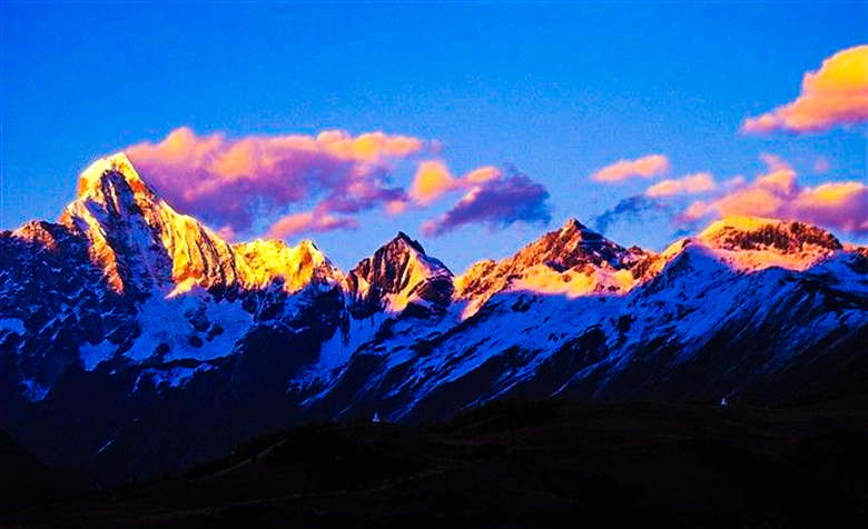【目的地简介】:四姑娘山位于四川省阿坝州小金县与汶川县交界处,距成都市235千米,由四座边绵不断的山峰组成,它们从北到南,在3.5千米范围内一字排开,从幺姑娘、三姑娘、二姑娘到大姑娘,其高度分别为6250米,5664米、5454米,5035米,其中幺姑娘山峰是四川省阿坝州第一高峰。这四座山峰长年冰雪覆盖,如同姿容俏丽的四位少女亭亭玉立于长坪沟和海子沟两道银河上。四姑娘山中以幺妹身材最为苗条,姿容最为俊秀,与“蜀山之王”贡嘎山(7556米)遥遥相对,素有“蜀山之后”、“东方阿尔卑斯山”之称。这里终年积雪,冰清玉洁,根连地厚,峰插天高,白云浮玉,光摇烟霞,山麓下有5000多平方米的草坪,草坪上百花点点,是登山探险的理想场所。