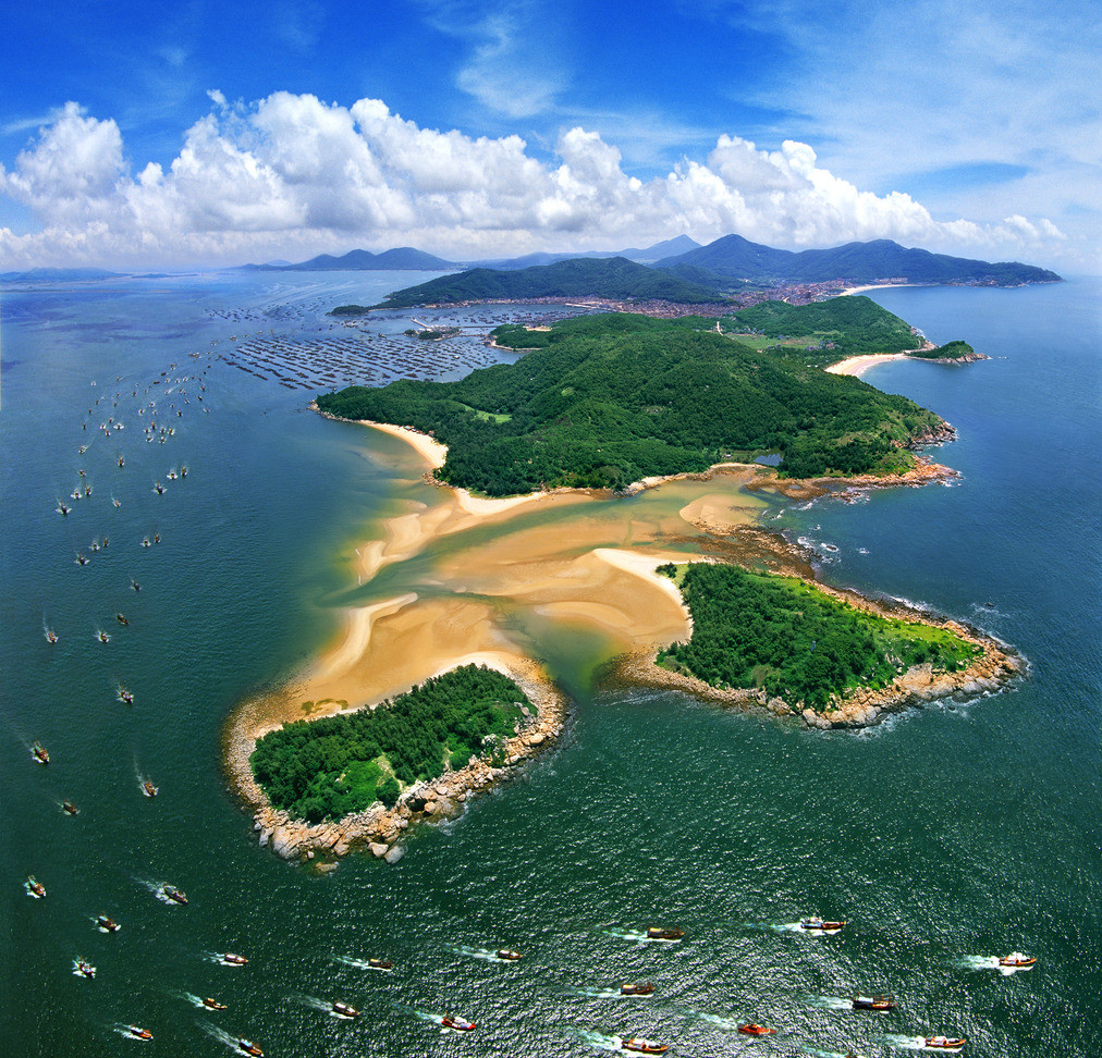 海陵岛 海陵岛银海城十里银滩风景旅游区位于广东省阳江市海陵岛南面,滩长8000米,平均宽150米,是海陵岛最大的海滩。银海城旅游度假区三面环绕着翠岭青山,南面延伸着洁白宽阔的沙滩,阳光白沙、碧浪青山交织出一幅亚热带风情画卷。旅游风景区包括四个部分:皇宋螺城、宾馆别墅区和海滩公园浴场区。宾馆别墅区以主题区建筑模式进行规划,设有民族别墅苑、苏州苑、太空城、蒙古城等若干组,汇集中国多种民族建筑风格,目前民族苑已建成5套座,其他类型别墅3座,在沙滩公园还建有牛仔美食城、啤酒屋以及64栋木结构沙滩情侣屋。